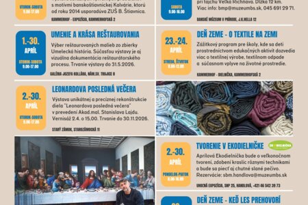 Najväčším lákadlom mesiaca je bezpochyby výstava „Leonardova Posledná večera“, ktorej slávnostná vernisáž sa uskutoční 2. apríla o 15:00 v Starom zámku. Návštevníci budú mať jedinečnú príležitosť vidieť precíznu rekonštrukciu svetoznámeho diela v podaní akademického maliara Stanislava Lajdu. Výstava, ktorá potrvá až do konca novembra, ponúka fascinujúci pohľad na detaily a symboliku tohto renesančného majstrovského diela.