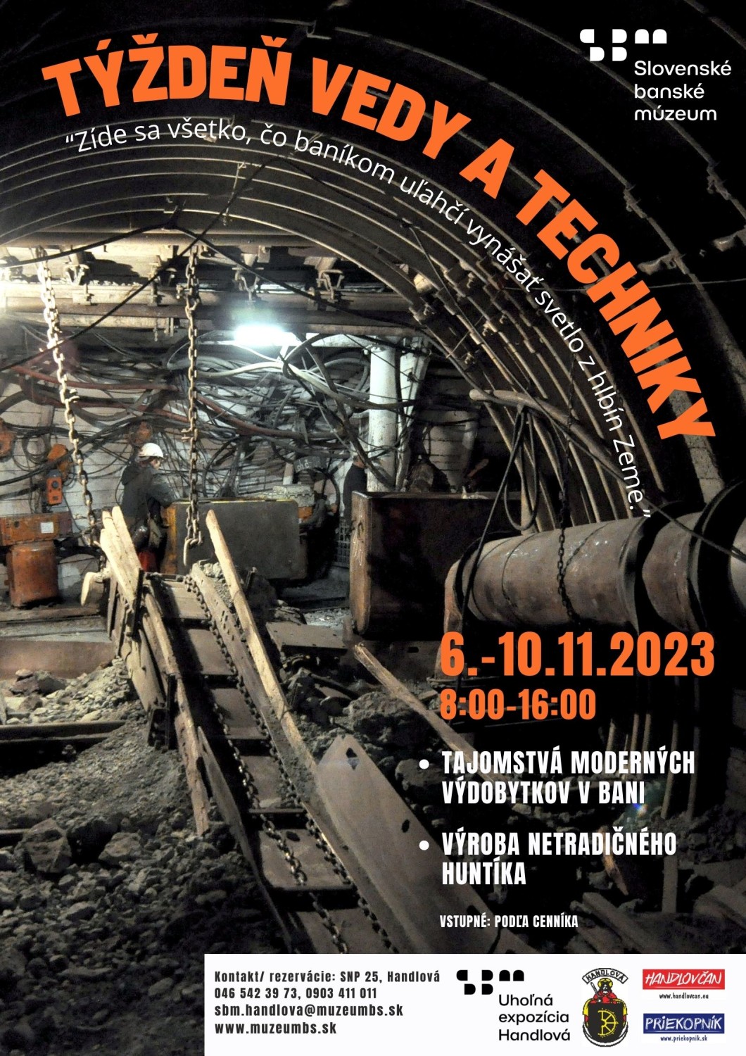Slovenské banské múzeum pozýva do Uhoľnej expozície Handlová, kde sa v dňoch 6.-10. november 2023 uskutoční podujatie Týždeň vedy a techniky s podtitulom „Zíde sa všetko, čo baníkom uľahčí vynášať svetlo z hlbín Zeme”.